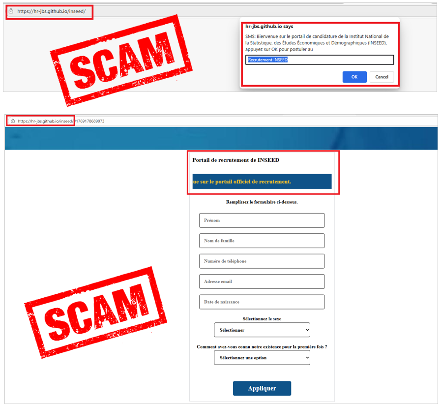 Alerte – Lien de Phishing prétendant annoncer un recrutement au sein de l’Institut National de la Statistique et des Études Économiques et Démographiques (INSEED).